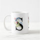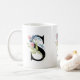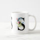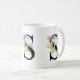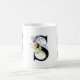 Une tasse à café personnalisée avec la lettre "S" monogramme, avec des illustrations décoratives aquarelle florale et feuillage. Customisez facilement avec votre nom ou créez un cadeau unique pour vos proches.