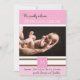 Ce précieux design de faire-part bébé est une façon merveilleuse de célébrer votre nouvelle arrivée. Ce design a un arrière - plan rose clair bloqué avec des rayures blanches et brunes. Dans le centre est un endroit pour votre photo personnalisée de votre fille. En haut, il dit : Nous sommes fiers d'accueillir et le nom de votre bébé. Sous la photo il y a un endroit pour son premier monogramme initial. En bas, il y a une place pour les statistiques de naissance de votre bébé, et les noms des parents.