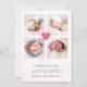 Faire-part bébé adorable en photo collage, avec place pour quatre photos carrés de votre belle petite fille. Au milieu, un coeur rose avec le monogramme de votre bébé. Et sous le nom et les statistiques de naissance de votre bébé, "bienvenue" est écrit dans une belle police de calligraphie rose pâle.