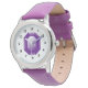 Monogrammé violet Amethyst gemstone logo fille montre. Montre personnalisée personnalisée avec le nom de l'enfant ou la lettre initiale monogramme. Joli bijou en pierres précieuses thème chronomètre design horloge pour la fête d'anniversaire de petite fille. Faites-en un pour fille, petite-fille, cousin, etc.