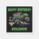 Fügen Sie aufregende Monster-Truck-Action zur Feier hinzu mit diesem spannenden Monster-Jam-Design mit dem legendären Grave-Digger-Truck. Vor einem knalligen schwarzen Hintergrund springt der ikonische Monster-Truck über die Mitte des Designs mit seiner charakteristischen Schädelgrafik, hellgrünen Flammen und übergroßen Reifen, die die hochenergetische Aufregung einfangen, die Fans lieben. Ein lebendiges lila-gelbes Schachbrett-Rennmuster unter dem Truck verleiht Bewegung und einen renninspirierten Look, der direkt aus einer Monster-Jam-Arena kommt.