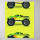 Ein gewaltiger Monsterwagen, seine raue Fassade mit lebhaften Farben und waghalsigen Aufklebern, rauscht mit einer Aura des Powers und der Aufregung vor einer lebendigen grünen Kulisse, die den aufregenden Geist des Off-Road-Abenteuers und des durch Adrenalin angetriebenen Triumphes verkörpert. Der auffallende Kontrast zwischen dem kühnen LKW und dem belebten Kalkgrün schafft ein dynamisches visuelles Spektakel.