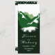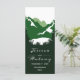 Cérémonie des montagnes vertes et des conifères et carte du mariage de fête. Un design de mariage élégant avec une chaîne de montagnes à travers les conifères et vos noms dans le style manuscrit. Le dos comprend des bordures vert foncé et blanc avec des pois blancs sur le dessus et au bas de la carte.
