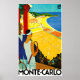 Dieses Vintage Werbeplakat ist für Monte-Carlo. Es zeigt einen Mann und eine Frau in Tennisoutfits, die auf den Strand schauen. Die Farben sind lebendige Blues, Orangen und Grüntöne.