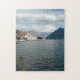 Ein wunderschöner Panoramablick auf das Dorf Perast in Montenegro ist auf einem Rätsel gedruckt.