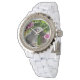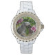 Congo African Grey Parrot posant parmi les fleurs violettes de l'orchidée Phalaenopsis dans le jardin. Une jolie photo pour les amateurs d'oiseaux en vous !