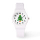 Illustration of a bright green Christmas tree. A gold star sits on top and the tree is dressed up with pink, blue and orange decorations.