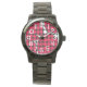 Cette montre pour femmes a un design moderne du milieu du siècle de diamants noirs solides à l'intérieur des contours de diamants noirs avec des lobs roses sous eux, le tout sur un champ de blanc.