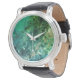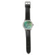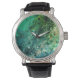 Une composition abstraite dynamique présente un ensemble de formes tourbillonnantes et de motifs dans différentes nuances de vert, noir et bleu
