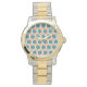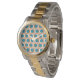 Cette montre a un design moderne du milieu du siècle des cercles orange ouverts avec des cercles turquoises solides qui traversent le motif avec des lignes verticales turquoises et des lignes horizontales orange.