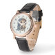 Une montre avec un kawaii illustration d'un hibou aux yeux grands dans une robe d'hiver et un foulard tenant un café chaud.