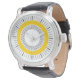 Un visage de montre avec un design de cercles concentriques, dans lequel des rayons sont disposés pour marquer les minutes et les heures dans le cercle extérieur. Cette version a un premier cercle intérieur de couleur solide et la deuxième bague intérieure a des rayons minuscules. Tous les rayons s'alignent correctement et les heures sont marquées d'une ligne plus audacieuse dans le cercle extérieur, offrant à la fois une face d'horloge décorative mais pratique.