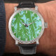 Un motif est composé de palmiers tropicaux contre un ciel dégagé, avec un effet postérifié. Design vert et bleu. .