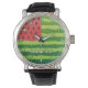 Drapeau de pastèque rouge et vert avec rayures et graines. Texte personnalisé.