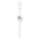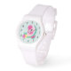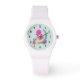 Une montre une jolie illustration d'un flamant rose avec quelques pastèques et ananas. Couleurs rose et vert. L'été et tropical. L'arrière - plan est de couleur vert pâle avec des pois blancs. Clock face est une police de style art déco.