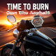 This close-up image features a unique watch face with a vibrant, action-packed illustration. A custom trike, engulfed in vivid orange and yellow flames, dominates the design. The dark background accentuates the fiery motif, while silver numbers and watch hands maintain functionality, creating a bold and energetic accessory for motorcycle enthusiasts.