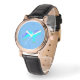 Cette montre étonnante présente une image d'art numérique d'une mignonne bébé licorne magique bleue garçon. Le corps principal de la licorne est bleu et la crinière et la queue sont de deux nuances de bleu différentes. La licorne a des sabots dorés et une corne en or brillant vif sur la tête. Il a un œil en forme de diamant bleu. La licorne a un grand sourire sur le visage.