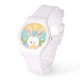 Un adorable lapin de Pâques rose et blanc se jette derrière trois oeufs peints et teints dans un jardin d'herbe, de fleurs et de marguerites. Il peut être personnalisé et monogrammé avec votre initiale, lettre ou monogramme. Oeuvre © Chrissy H. Studios, LLC. Tous droits réservés.