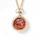 Dragon rouge inspiré par le papier traditionnel chinois coupé en cercle avec arrière - plan rouge + arrière - plan doré. Design sur Montre de collier d'or avec des chiffres romains (semi-transparents). Carte de voeux, carte postale et autocollant. Parfait pour le bois chinois Dragon Année 2024.
