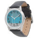 Cette montre pour hommes a un design géométrique d'un grand rectangle turquoise dans le coin supérieur gauche, des bandes turquoises plus foncées dans le coin supérieur droit, un rectangle turquoise plus léger sous les bandes, et des lignes noires dans le fond. Si vous aimez le design mais préférez différentes couleurs, envoyez-moi un message.