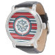 Design nautique avec décoration de boussole en forme ronde sur arrière - plan rayé rouge, bleu et blanc