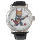 A graphic image of a cute white kitten playing a pink guitar The kitten's expression is playful,