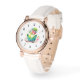 Une montre avec une jolie illustration de perroquet. Un petit perroquet vert aux couleurs bleu et jaune se mélangeant. Le cou a une teinte vif de rose rougeâtre.
