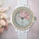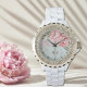 The design is set within a crystal-accented metal bezel and paired with a glossy white enamel alloy bracelet, creating a look that is feminine, graceful, and effortlessly polished. Subtle gold-tone detailing on the dial adds warmth and balance, allowing the floral artwork to remain the focal point.