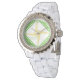 Ce motif a été inspiré par un motif de blocs de courtepointe nommé "Perpetual Motion". Une roue à 4 points marque les 3, 6, 9 et 12 heures et est entourée de pois verts et blancs.