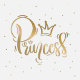 Illustration du mot "Princesse" dans une police stylisée et cursive, rendue dans une couleur or métallique. Le mot est orné de petites icônes de couronne placées au-dessus de "i" et entre "P" et "r". Une couronne plus grande est placée au-dessus du mot, ajoutant au thème royal. L'arrière - plan est un blanc épuré, parsemé de petits points dorés qui créent un effet subtil et festif. Le style général est élégant et décoratif, adapté aux créations festives ou thématiques.