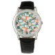 Cette montre pour hommes a un design moderne du milieu du siècle de rectangles biaisés avec des trous blancs dans les tons turquoises et orange.