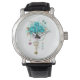Clé d'or antique aux roses turquoise tendance décorée de feuilles d'or blanc et de perles rose et bleu. Couleur tendance. Rose turquoise. Blanc doré. Tiffany bleu.