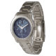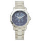 Montre avec le symbole zodiaque pour Gemini en bleu argenté doux, recouvert d'étoiles de la constellation, contre un arrière - plan étoilé en bleu nuit profond à noir.