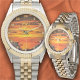 Peinture Collection "Sunset Plaza Marina 2584" Parfait pour l'usure quotidienne, cette montre à deux tons argent et or peut être personnalisée pour correspondre à votre style. Ajoutez votre texte pour le customiser pour une déclaration de style extraordinaire ! Personnalisez la page produit ou cliquez sur le bouton "Personnaliser" pour obtenir plus d'options de conception. Le design créé à partir de ma peinture "Sunset Plaza Marina 2584" capture un coucher de soleil vibrant avec des stries de couleurs orange et rouge remplissant le ciel, encadré par la végétation silhouette et les plantes fleuris au premier plan. Les teintes lumineuses du ciel contrastent considérablement avec les contours sombres du paysage, créant une scène sereine mais dramatique. Les produits correspondants sont disponibles dans cette collection.