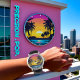 This round wall clock features a breathtaking tropical sunset scene. Silhouetted palm trees frame a vibrant sky ablaze with fiery oranges, yellows, and deep pinks, casting a warm glow over tranquil blue waters. The clock has clear white numerals and black hands, making it a functional art piece. It's perfect for adding a serene, vacation-like ambiance to any room.