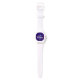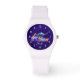 Une montre avec vos initiales monographiques personnalisées avec une aquarelle numérique d'un troupeau d'animaux sauvages qui courent ensemble. Les animaux comprennent un dauphin saut, une girafe, un éléphant, un kangourou, un rhinocéros et un chat sauvage. L'arrière - plan est un design abstrait violet foncé.