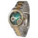 Bijoux, montre en or avec chaîne d'or et clés sur un arrière - plan texturé vert. Style Steampunk.