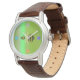 eWatch Watch Watch a un bracelet brun, visage métallique vert avec Honey Bees Sound Waves and Flowers à 12-3-6-9.