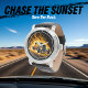 This striking watch face features a vintage-style yellow hot rod car with prominent orange and red flames painted on its side, racing along a dark, reflective road. The background is solid black, emphasizing the dynamic energy and intense fiery elements of the vehicle, creating a powerful design for automotive enthusiasts.