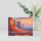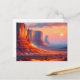 Lebhafte Farben zeigen eine ruhige Wüstenlandschaft während des Sonnenuntergangs, wobei markante Mesas lange Schatten spenden. Der Himmel ist in Orange-, Rosa- und Blautönen gehalten und spiegelt das Sonnenlicht im Hintergrund wider.