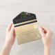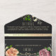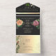 Elégant, moderne, moody romantique faire-part de mariage tout en un noir avec faux dentelle florale or, fleurs roses rose et orange aquarelle et image personnalisée du couple à l'arrière. Ajoutez votre photo, les détails du mariage et rsvp.