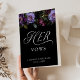 Elegant floral wedding vow book featuring a top border of burgundy and purple flowers with lush green leaves and dark berries. The floral design is complimented by modern typography. Personalize the purple floral wedding vow book with your names and wedding date. Add your typed or handwritten vows on the inside of the card. The back of the card features a matching floral bouquet.