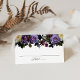 Moody floral wedding place cards featuring a top border of ivory, purple, and burgundy flowers with lush green foliage and dark berries. The back of the burgundy and purple floral place cards features a matching floral pattern. The elegant floral place cards are perfect for Halloween or autumn wedding receptions, rehearsal dinners, and other special events.
