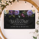 Elegantes, blumengeschmücktes Begrüßungsbanner mit einem hohen Rand von Elfenbein, lila und bordeauxfarbenen Blume mit üppigem grünem Blattwerk und dunklen Beeren. Das lila Blumenbanner zum Begrüßen wird durch moderne Typografie ergänzt. Personalisieren Sie das gotische Blumenbanner mit Ihren Namen. Entworfen, um mit unserer Moody Gothic Floral Hochzeitskollektion zu koordinieren.