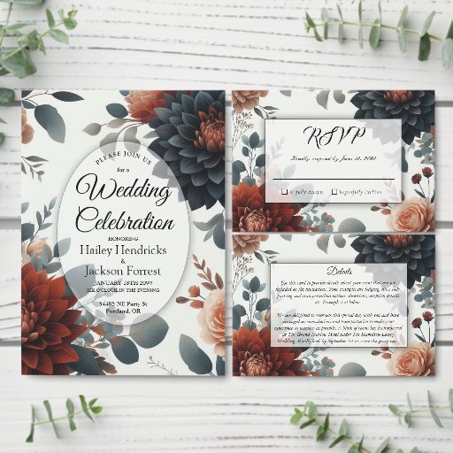 Capture the romance of autumn with the Moody Rustic Fall Florals wedding invitation. Featuring deep burgundy dahlias, soft blush roses, and slate-blue eucalyptus leaves, this elegant design blends rich seasonal tones with a touch of vintage charm. The moody color palette evokes a cozy yet sophisticated atmosphere, perfect for rustic barn weddings, vineyard celebrations, or intimate fall gatherings.