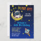 Moon Adventure Birthday Party Einladung enthält Text-Sprichwort, 3,2,1— Blast off! Es hat einen anpassbaren Astronauten, der mit einem Halbmond posiert. Als Nächstes gibt es einen Platz, um den Namen des Kindes einzutragen. Ein Raketenschiff fährt unten vorbei. Alles gegen einen Sternenhimmel. Auf der Rückseite der Einladung befinden sich viele coole Raumbilder. Freuen Sie sich auf eine Geburtstagsparty des Mondabenteuers.