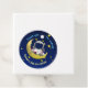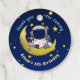 Moon Adventure Birthday Favor Tags (rund) zeigen einen Astronauten, der von einem Halbmond posiert, mit Sternen um ihn herum. Set auf dem Hintergrund des Sternenhimmels. Anpassbarer Kurvetext über dem Astronauten sagt: Danke, dass du gekommen bist." Im folgenden Text steht "Ethan's 6th Birthday". Perfekt, um sich bei einer Geburtstagsfeier für kleine Raumfans an die Favoriten zu knüpfen.