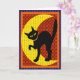 Eine Halloween-Grußkarte mit einer schwarzen Katze, die den Mond überquert. Gemusterte "Quilt"-Typgrenzen verstärken dieses farbenfrohe Bild.