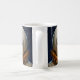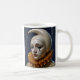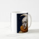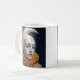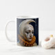 Bild einer weißen Keramik-Tasse mit einem glänzenden 3D Pierrot Clowngesicht mit halbmondfarbenem Hut und goldfarbenem Rüffelkragen auf sternigem nächtlichem Hintergrund. Erleben Sie das Geheimnis und die Eleganz des Nachthimmels mit dieser bezaubernden Tasse des Mondes Pierrot. Mit einer hochauflösenden 3D-Rendering von Pierrot mit glänzender Porzellanoberfläche, halbmondfarbenem Hut und goldenem Rüffelkragen strahlt das Design eine traumhafte Melancholie und Eleganz aus. Umgeben von einer sternenvollen Nachtkulisse fühlt sich dieses einzigartige Stück wie eine Reise in einen poetischen Karneval. Ideal für Kunstliebhaber, Fantasy-Träumer, oder als eindrucksvolles gotisches Geschenk, ist es eine funktionale Tasse, die sich als Kollektivkunst verdoppelt.