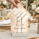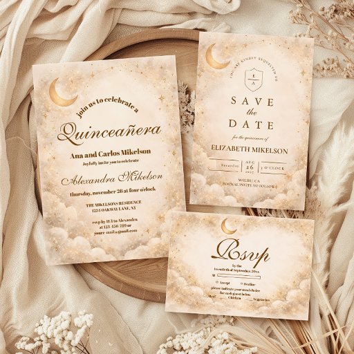 A luminous celestial design featuring delicate crescent moons and scattered constellation stars across a warm parchment background. A refined gold border frames the composition, while elegant script typography creates a graceful focal point worthy of such a meaningful milestone. The soft ivory and champagne tones give the entire piece a timeless, radiant glow. Perfect for a quinceañera celebration that feels romantic, elevated, and touched by starlight.